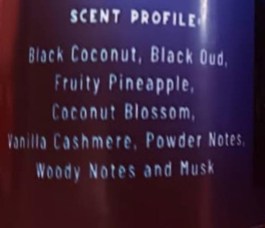 Scent Profile: Black Coconut, Black Oud, Fruity Pineapple, Coconut Blossom, Vanilla Cashmere, Powder Notes, Woody Notes, and Musk
